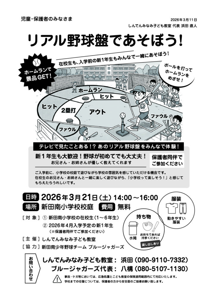 当日は、新田南小学校の在校生だけでなく、4月に入学予定の新1年生も参加予定です。入学前の子どもたちにとっては、学校の校庭で遊びながら雰囲気を感じてもらえる機会にもなればと考えています。